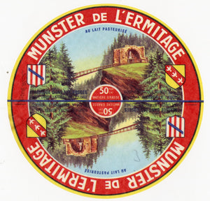 Antique, Unused, French Munster de L'Ermitage Cheese Label, Bridge, Lake