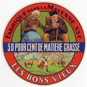 Antique, Unused, French Les Bons Vieux Cheese Label, Mayenne, Old Couple