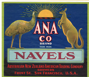 Vintage, Unused ANA CO. Navel Orange Fruit Crate Label || San Francisco, Ca.