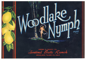 Vintage, Unused WOODLAKE NYMPH Lemon Fruit Crate Label || Woodlake, Tulare, Ca.