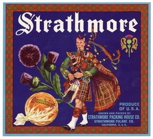 Vintage, Unused STRATHMORE Orange Fruit Crate Label, Bag Pipe || Ca.