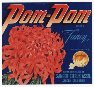 Vintage, Unused POM-POM Orange Crate Label || Sanger, California