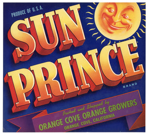 Vintage, Unused SUN PRINCE Orange Fruit Crate Label || Orange Cove, Ca.