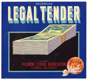 Vintage, Unused LEGAL TENDER Orange Fruit Crate Label || Fillmore, Ca.
