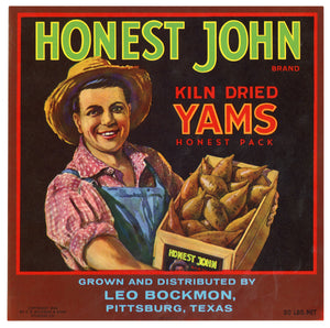 Vintage, Unused HONEST JOHN Yams Vegetable Label || Pittsburg, Texas