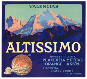 Vintage, Unused ALTISSIMO Orange Fruit Crate Label || Placentia, Orange Co, Ca.