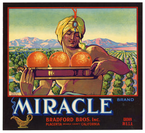 Vintage, Unused MIRACLE Brand Orange Crate Label || Placentia, Orange Co., Ca.