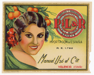 Vintage, Unused, 1920's Spanish PILAR Orange Fruit Crate Label || Valencia, Spain