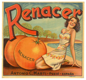 Vintage, Unused, French RENACER Orange Crate Label || Bathing Beauty