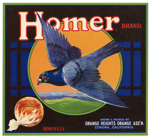 Vintage, Unused HOMER Orange Fruit Crate Label, Pigeon || Corona, California