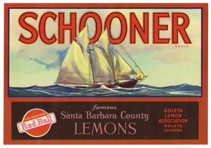 Vintage, Unused SCHOONER Brand Lemon Fruit Label || Goleta, Ca.