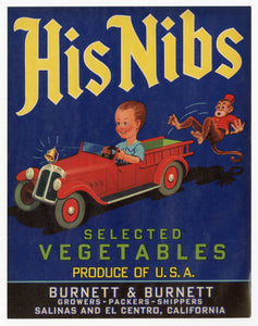 Vintage, Unused HIS NIBS Selected Vegetable Crate Label || Salinas, El Centro, Ca.