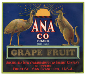 Vintage, Unused ANA Co. Brand Grapefruit Label, Emu, Kangaroo || San Francisco, Ca.