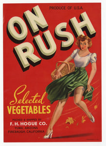 Vintage, Unused ON RUSH Vegetable Crate Label, Pinup || Yuma, Arizona