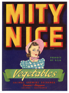 Vintage, Unused MITY NICE Vegetable Crate Label || Salinas, Ca.