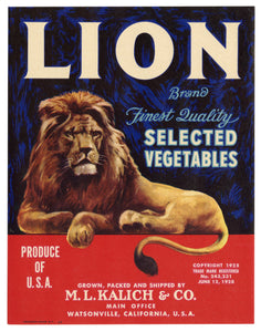 Vintage, Unused LION Vegetable Crate Label || Watsonville, Ca.