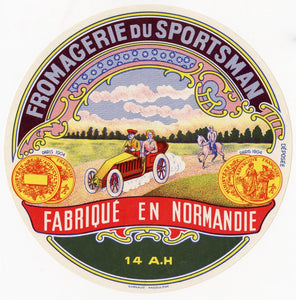Antique, Unused, French Fromagerie du Sportsman Cheese Label, Auto, Normandy
