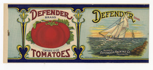 Vintage, Unused DEFENDER Brand Canned Tomato Label, Sail Boat || Trappe, Mo.