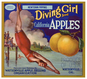 Vintage, Unused DIVING GIRL Brand Apple Crate Label || Watsonville, Ca.