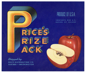 Vintage, Unused PRICE'S PRIZE PACK Apple, Fruit Crate Label || Yakima, Washington