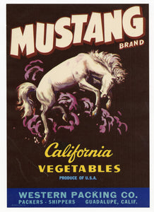 Vintage, Unused MUSTANG Brand Vegetable Crate Label, Horse || Guadalupe, Ca.