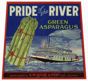 Vintage, Unused PRIDE OF THE RIVER Asparagus Vegetable Crate Label || Locke, Ca.