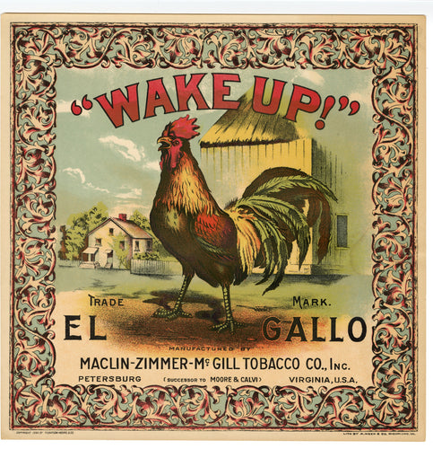 WAKE UP ROOSTER Caddy Crate Label, El GALLO || Maclin-Zimmer McGill Co., Antique