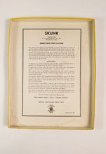 Wonderful vintage 1953 game of Skunk for children and adults. This game is complete and contains: the original game board, a full set of red, white and blue game pieces, two skunk dice and a score pad with blank sheets. The instructions for the game are printed on the inside of the top lid as well.