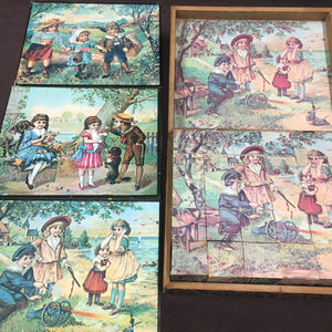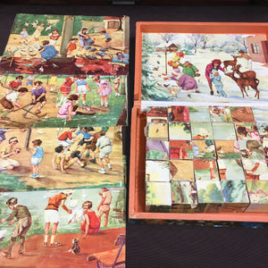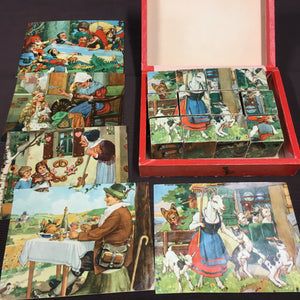 Antique 1920's Multi-Sided Block Puzzle Box Set, Four Illustrations