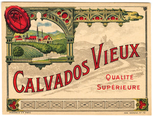 Antique, Unused, French CALVADOS VIEUX LABEL, Hard Cider, Castle, Brandy