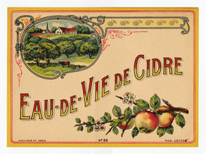 Antique, Unused, French EAU-DE-VIE DE CIDRE LABEL, Hard Cider, Calvados, Brandy