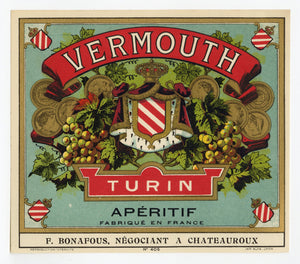 Antique, Unused, French VERMOUTH TURIN LABEL, Aperitif, Alcohol, Gold Ink