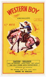 Vintage, Unused, Chinese WESTERN BOY Fireworks Cracker Crate LABEL ONLY, Cowboy, Macau, NOS  - Regular price